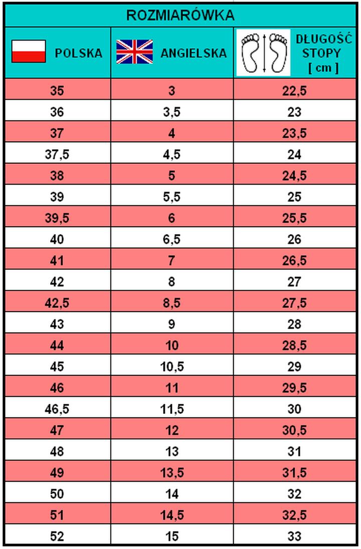Poniżej przedstawiamy różne systemy rozmiarów stosowane w branży obuwniczej: