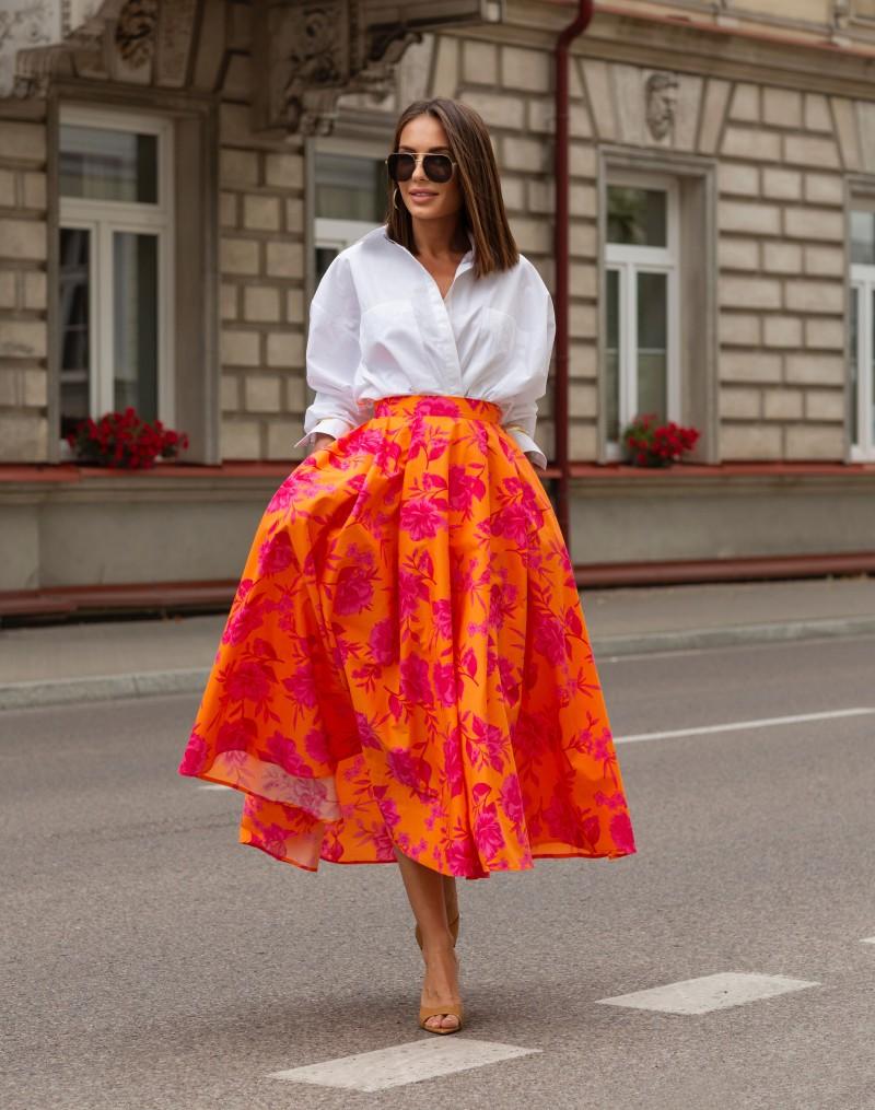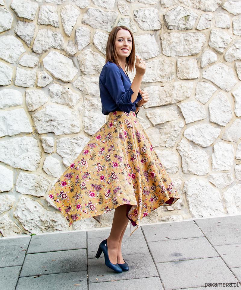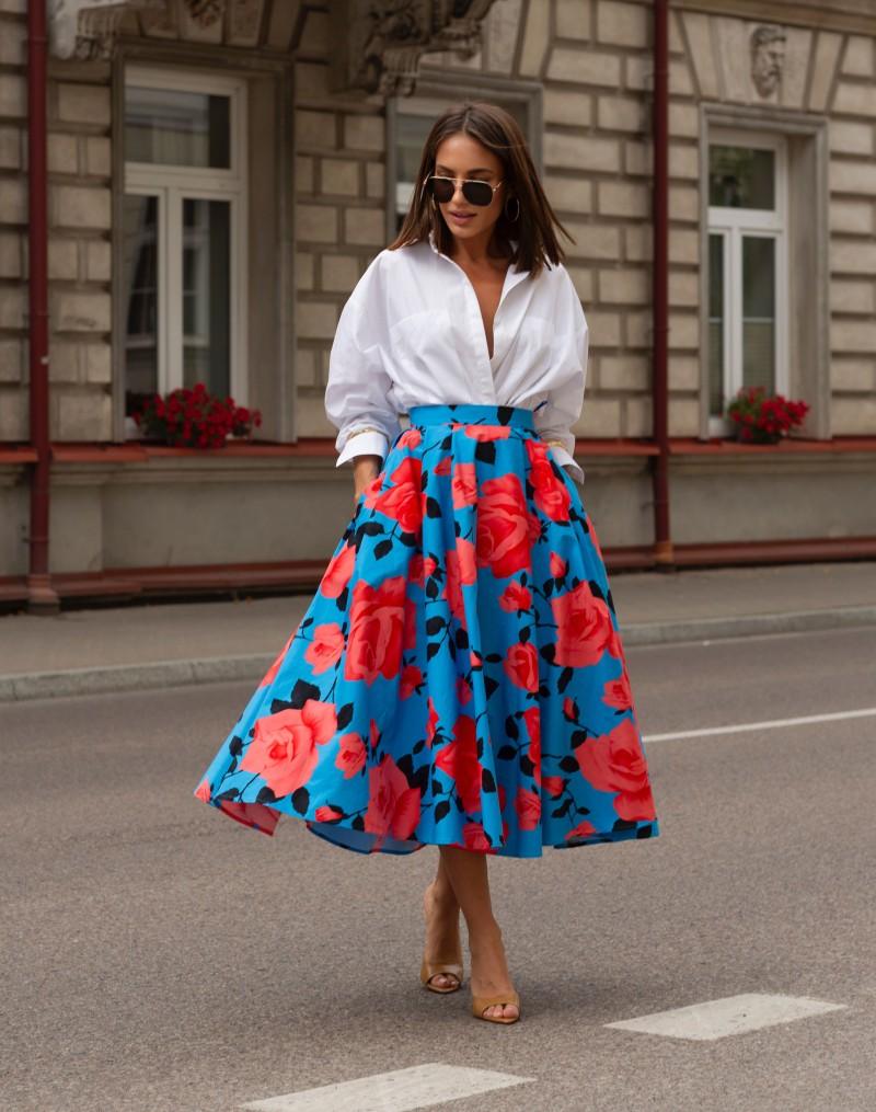 - Spódnica z koła w kwiaty zestawiona z klasycznym topem.